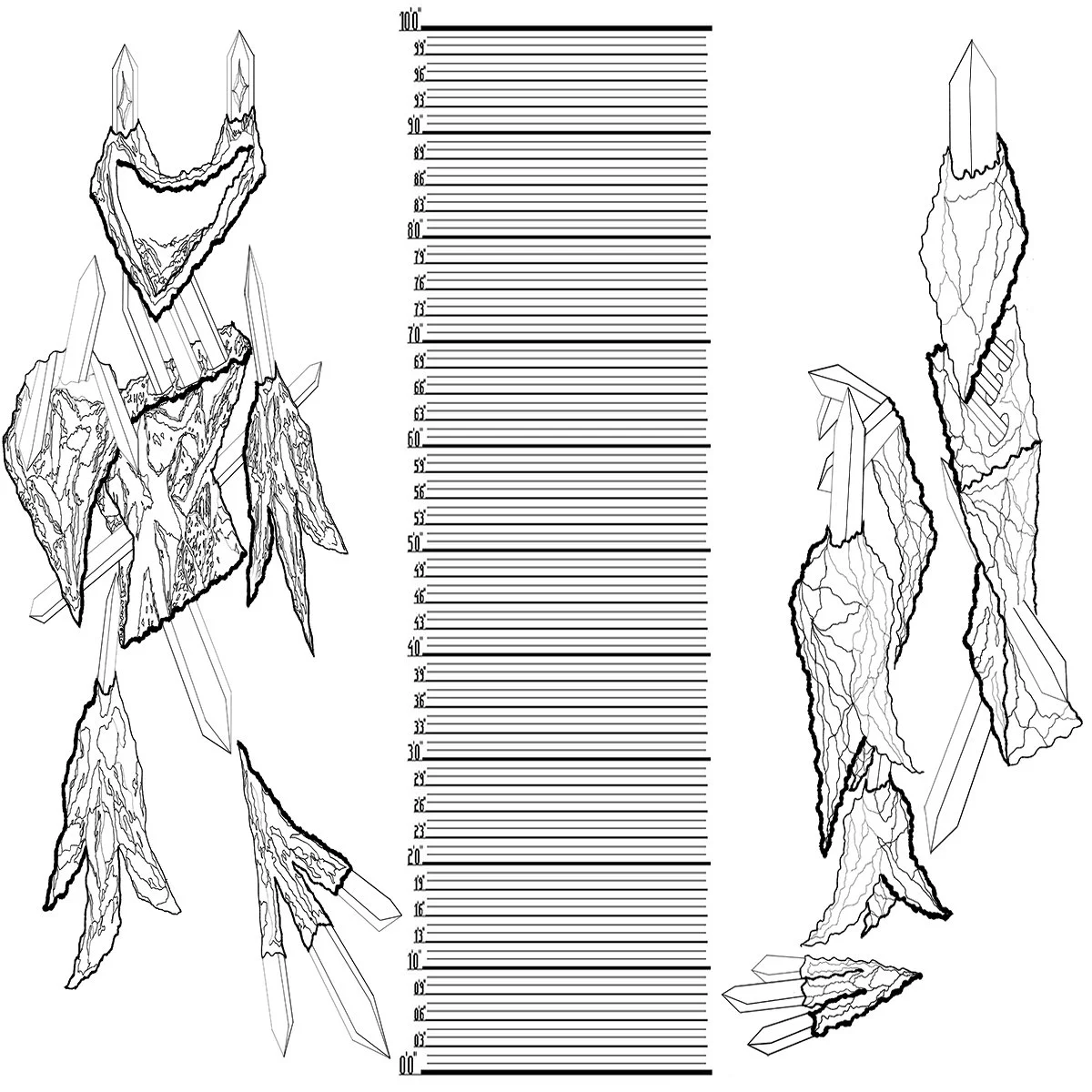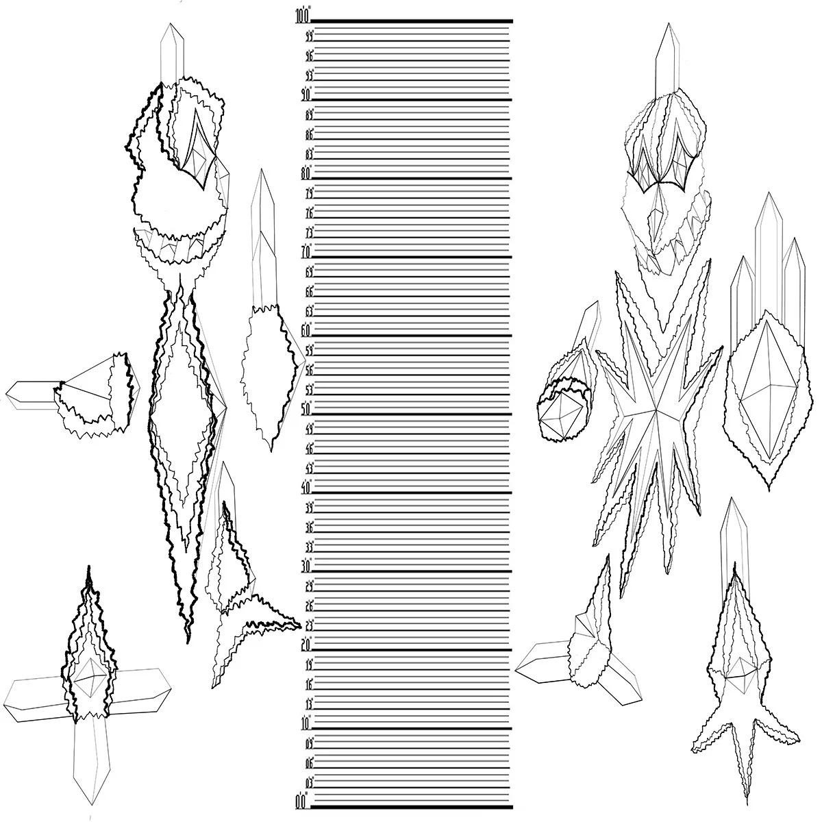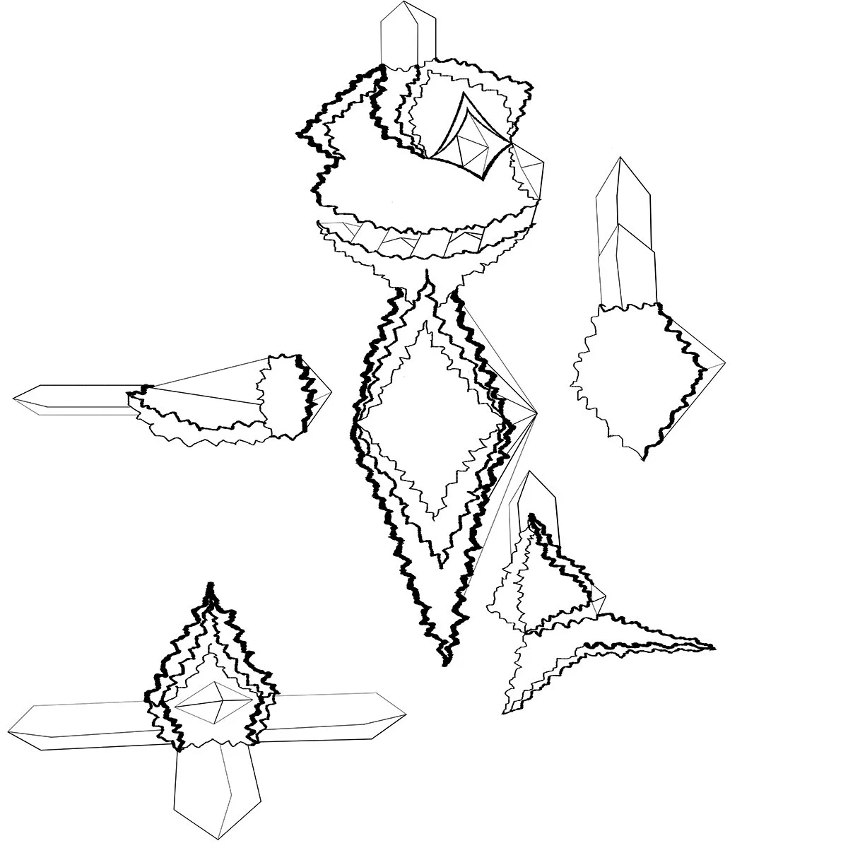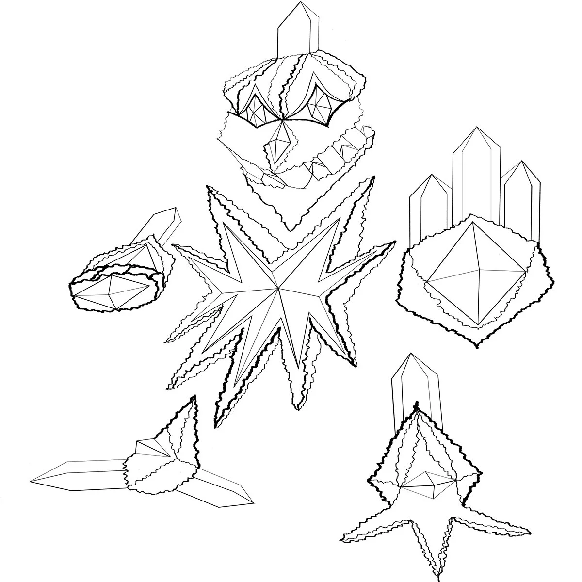 After brainstorming, I created Concept Art 1, showcasing eye and facial expressions, crystal shooting from the helmet, and varying crystal sizes. Concept Art 2 explores different torso shapes, while Concept Art 3 features my preferred designs with a neutral expression. Front View finalizes the design for 3D modeling, and the Side View provides reference for the image plane. The order from oldest to newest; Concept Art 1, Concept Art 2, Concept Art 3, Front View, and Side View.