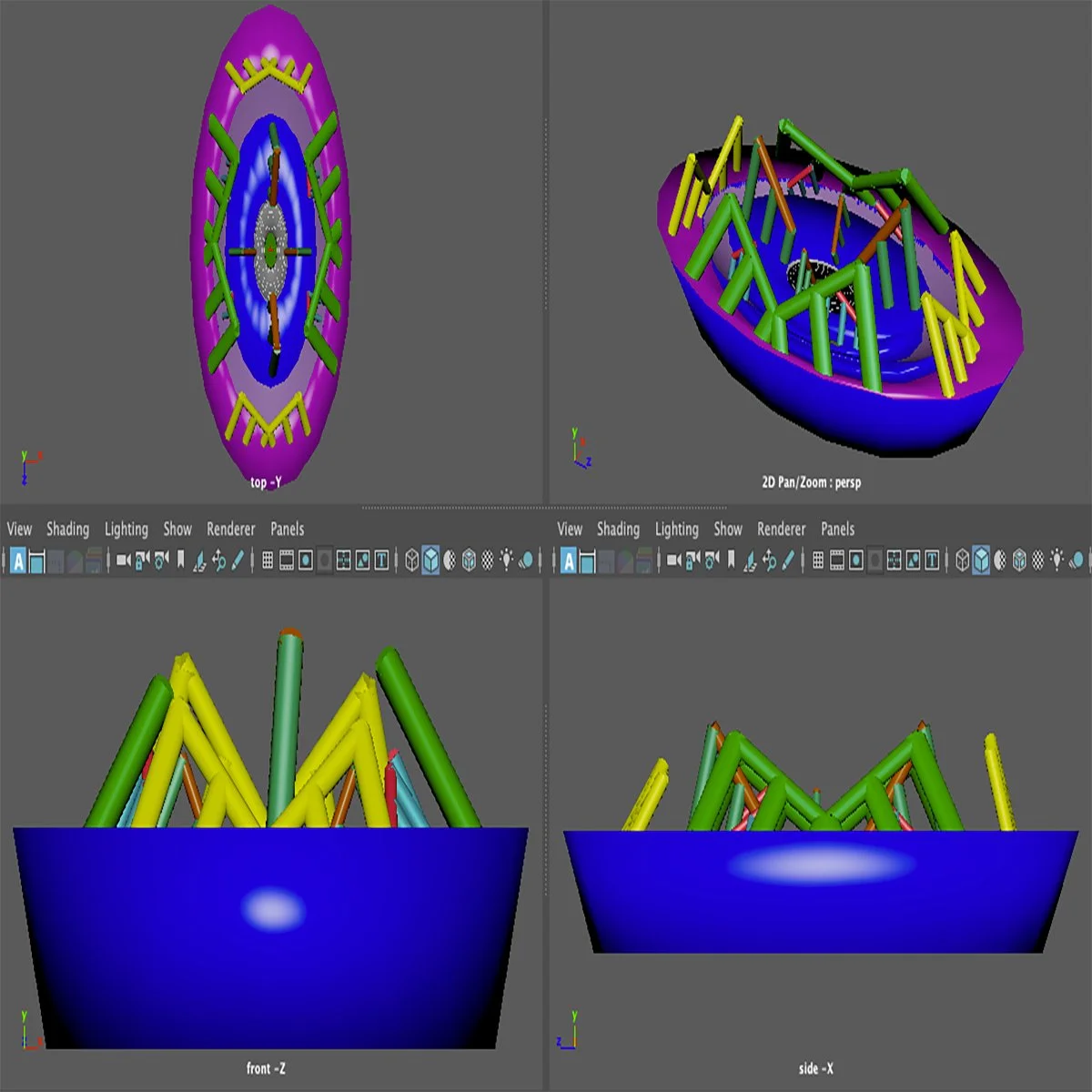 I researched track stadiums to understand their core components and designed the poles abstractly in terms of size, placement, and color to maintain cohesion with the world.